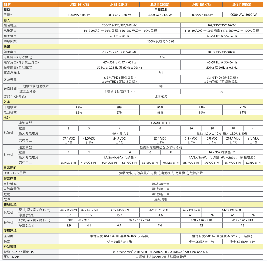 JNS11系列高频纯在线UPS功能特点 纯正弦波输出 •市电适应范围宽 •高输入功率因素(PF>0.99),节约能源及减少对电网的干扰 •自动跟踪选择选择输出频率 •可配置高频、大电流全隔离的快速充电器 •具备电池直流启动 •可实现远程监控及网络管理
